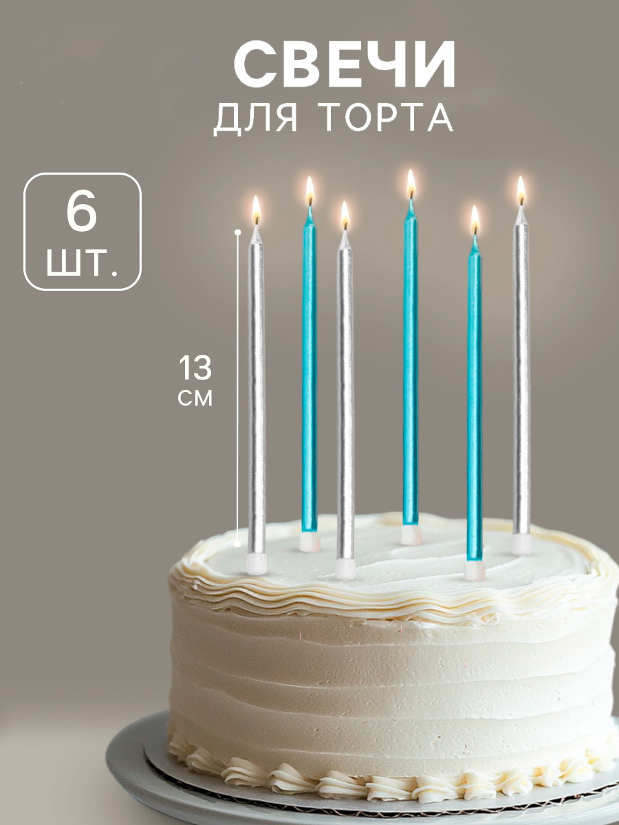 Свечи в торт "Ройс" голубые-серебро 13см 6 штук