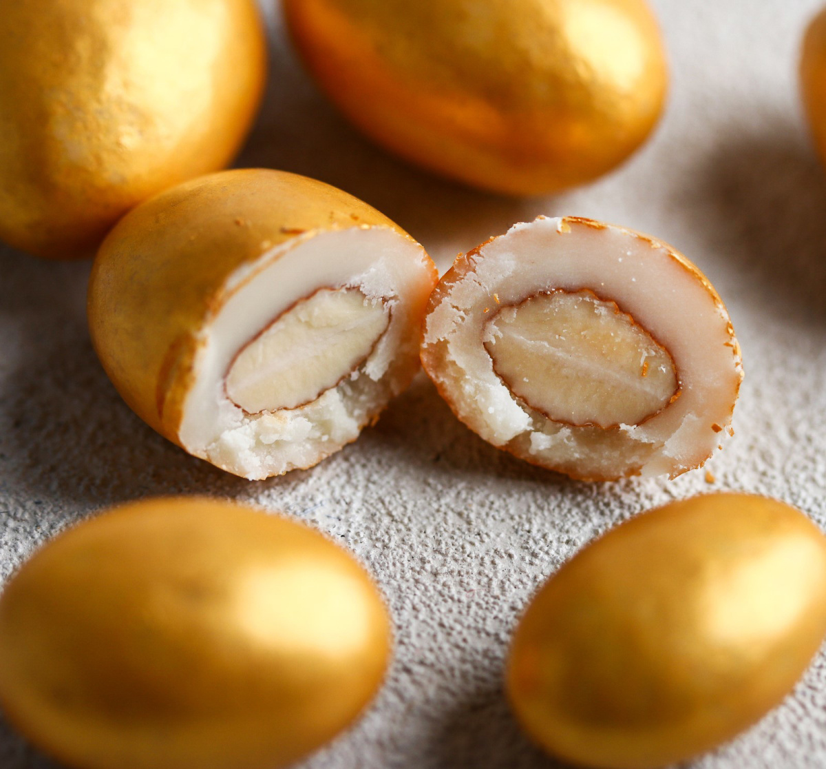 Состав: шоколадная глазурь (сахар, эквивалент какао-масла, какао тертое, какао-порошок, эмульгатор – лецитин, ароматизатор, идентичный натуральному, – ванилин), миндаль, глянец – комплексная пищевая добавка «Капол», пигмент – золото.