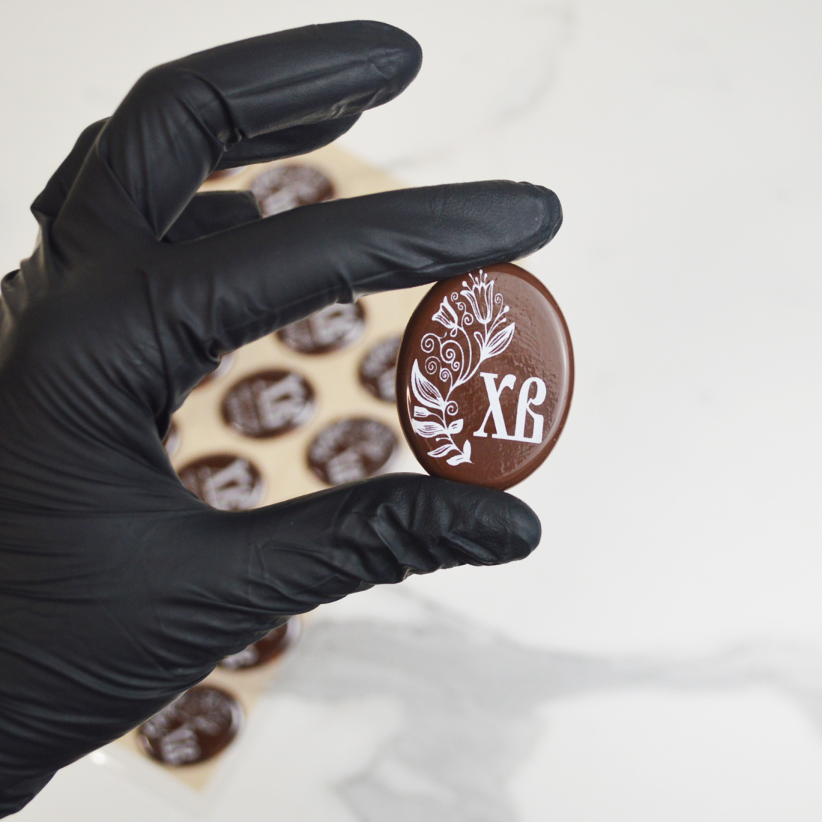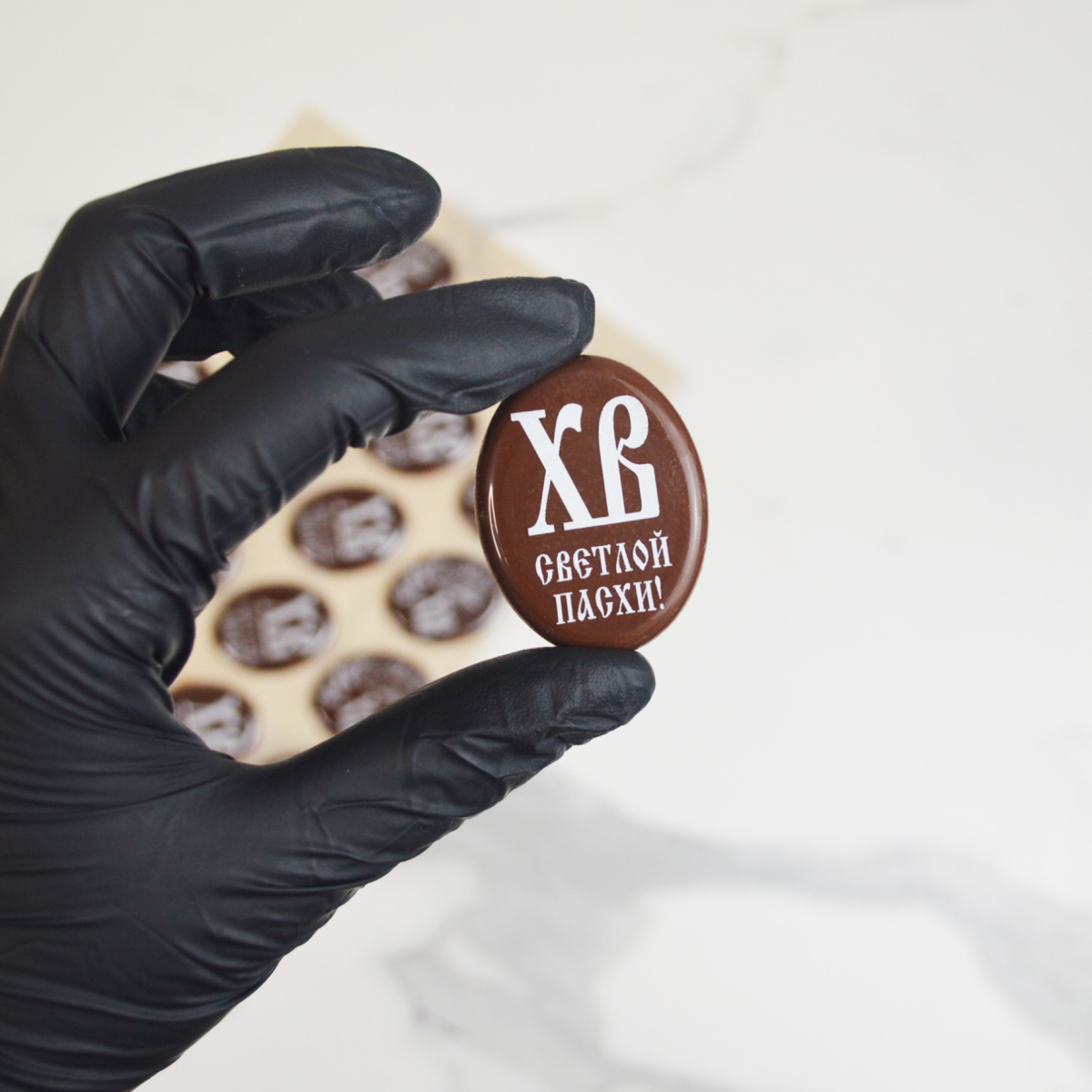 глазурь кондитерская (пудра сахарная, заменитель масла-какао нетемперированный лауринового типа (рафинированое дезодорированное пальмоядровое масло, в т.ч. модифицированное, эмульгаторы: сорбитан тристеарат, лецитин соевый, сыворотка молочная сухая, эмульгатор лецитин соевый, ароматизатор ванилин), вода, молоко сухое цельное с м.д.ж. 26%, сахар-песок, носитель глицерин, эмульгатор лецитин соевый, красители: диоксид титана, уголь растительный, кармин, комплексная пищевая добавка "Золото", регулятор кислотности кислота лимонная, загуститель пектин
