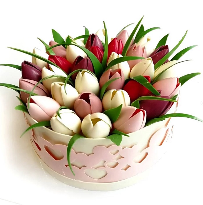 Темперированный шоколад или растопленную шоколадную глазурь распределить на трафарет и установить на торт, после застывания аккуратно снять трафарет с декора.