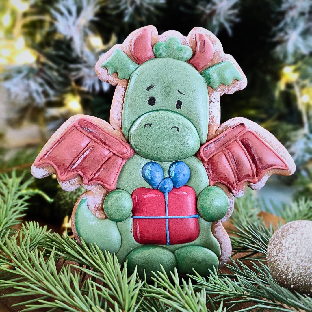 Вырубка с трафаретом в виде дракона с подарком, предназначена для вырезания и вырубки пряника, безопасный и прочный материал, легко и просто сделать нужные фигурки, лишних усилий для надавливания прилагать не нужно.