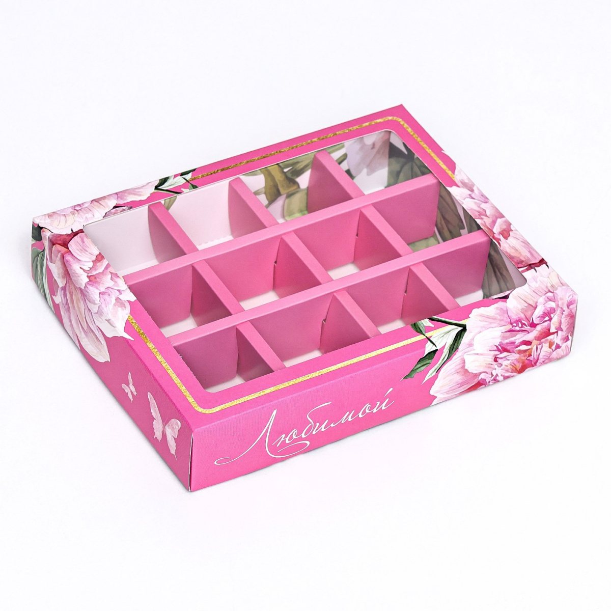 Коробка на 12 конфет ЛЮБИМОЙ розовые пионы 19х15х3,6см