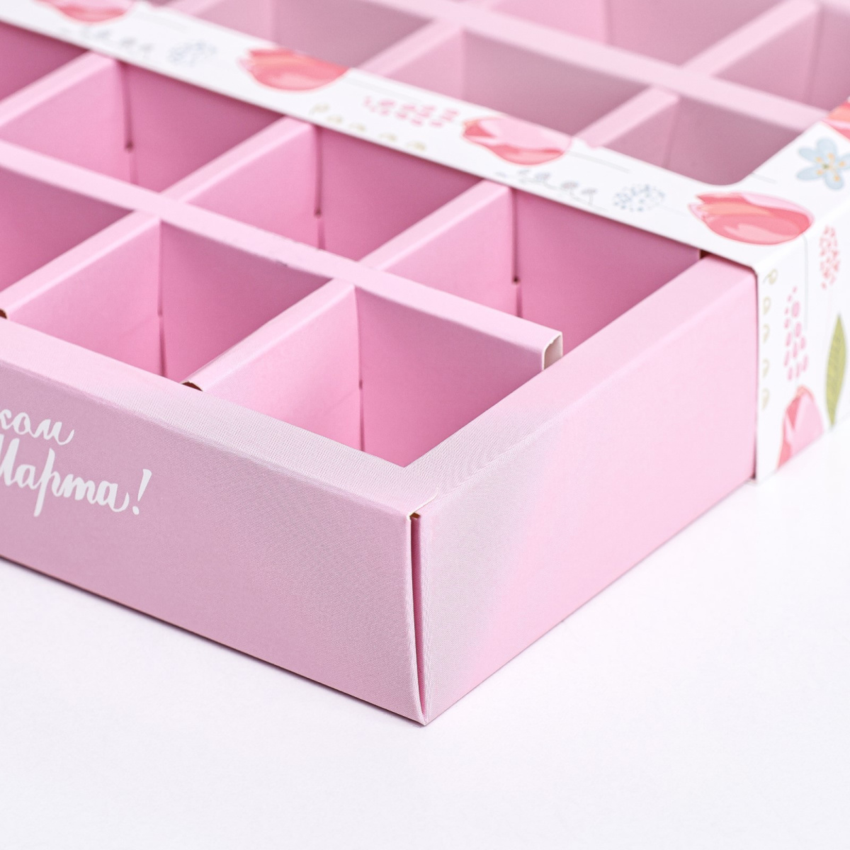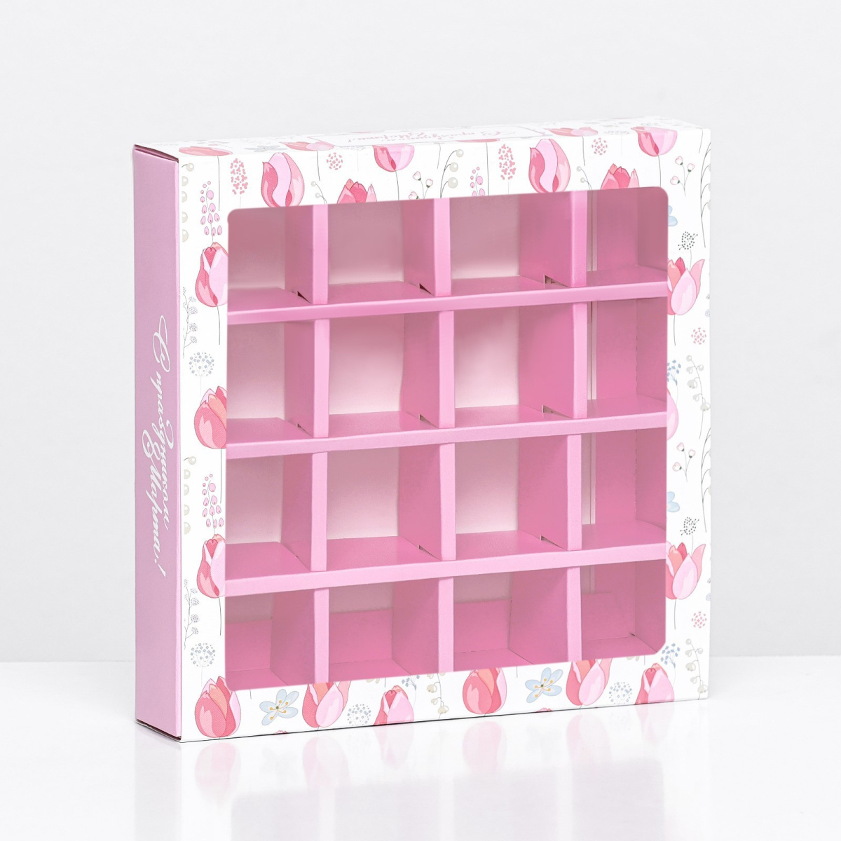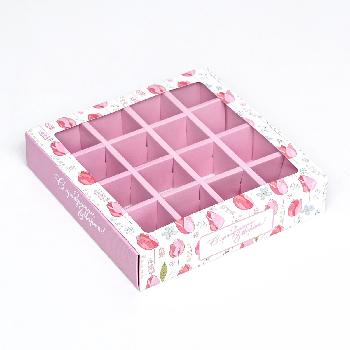 Коробка на 16 конфет с 8 МАРТА тюльпаны 17,7х17,7х3,8см