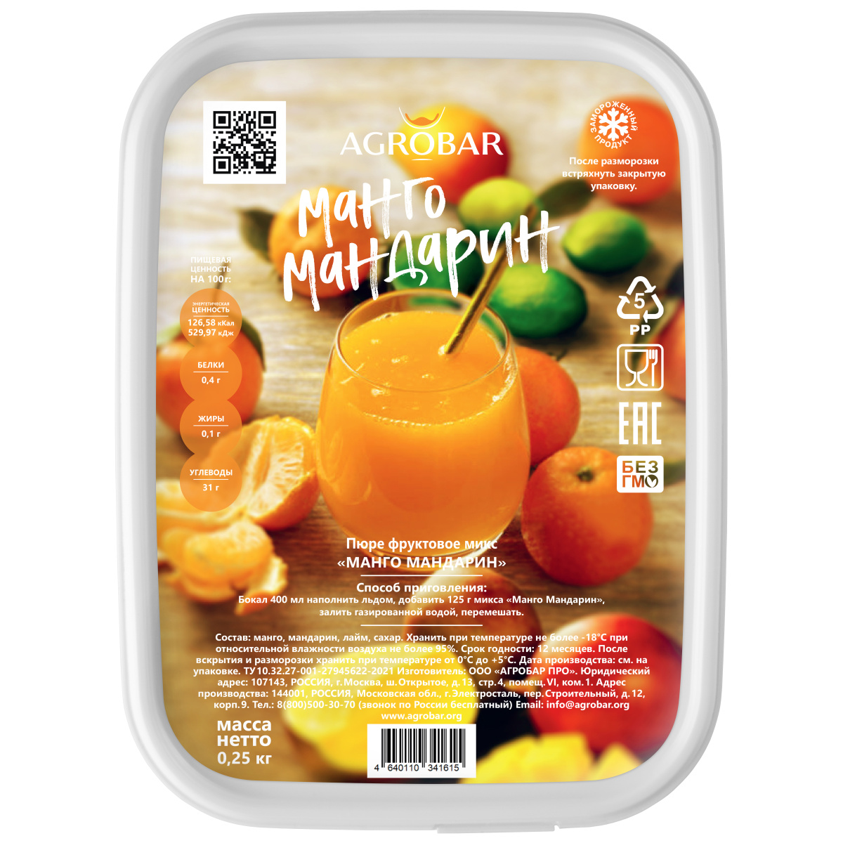 Замороженное пюре из манго и мандарина для добавления в кондитерские изделия, изготовления начинок для торта, капкейков, пирожных, приготовления смузи и коктейлей.