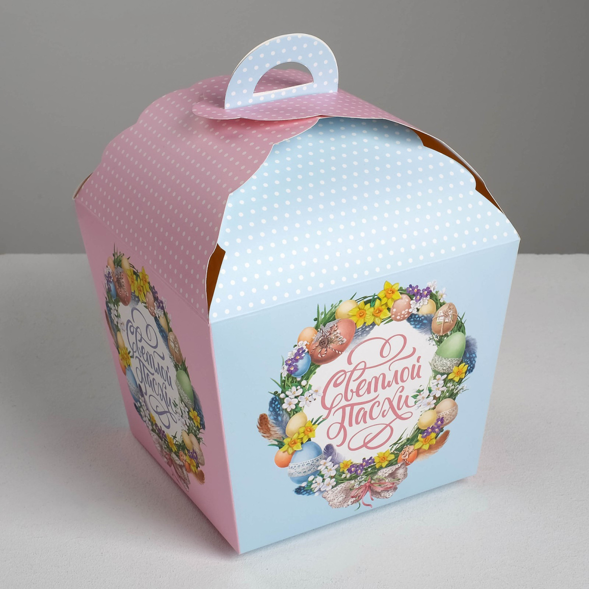—Коробка для кулича складная СВЕТЛОЙ ПАСХИ розово-голубая 14х14х26см