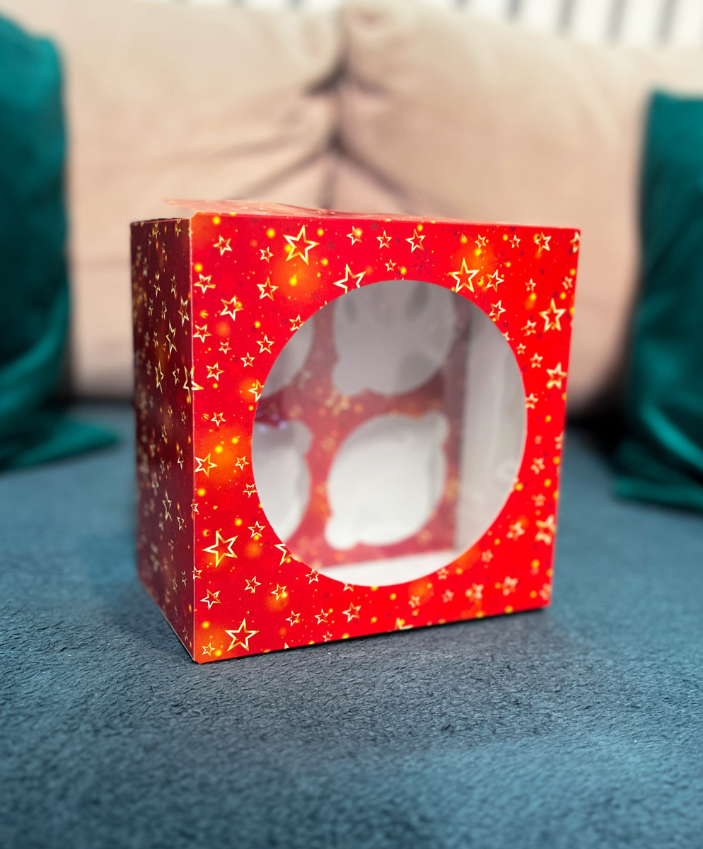 Коробка новогодняя для капкейков с золотыми звездами с круглым окошком стандартной сборки.