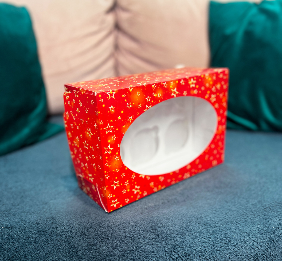 Коробка новогодняя для капкейков с золотыми звездами с овальным окошком стандартной сборки.