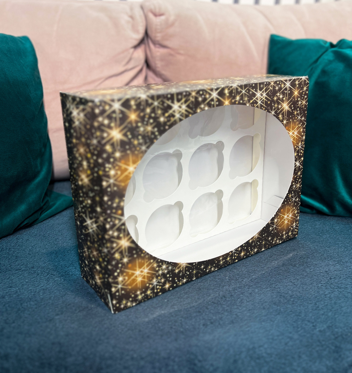 Коробка новогодняя для капкейков с овальным окошком стандартной сборки.